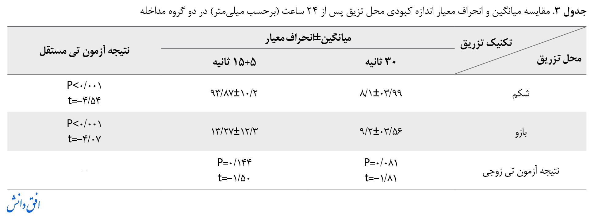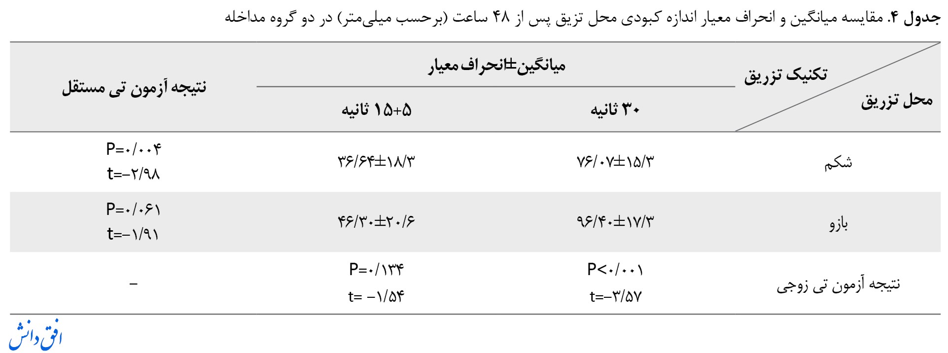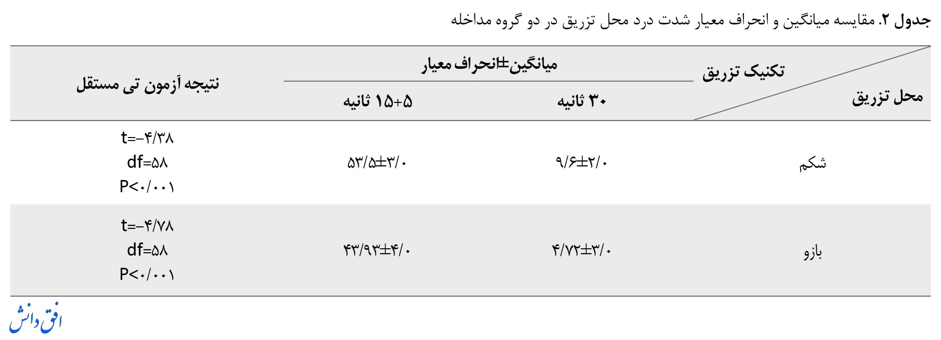 آزمون تی مستقل نشان داد میانگین شدت درد تزریق زیرجلدی در محل شکم و بازو در روش 30 ثانیه نسبت به روش 5+15 ثانیه به طور معنیداری کمتر است (0/001>P) (