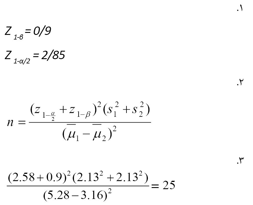 33]، با در نظر گرفتن توان آزمون 90 درصد، ضریب اطمینان 99 درصد و احتمال ریزش 20 درصد، حجم نمونه به دست آمد که برای هر گروه 30 نفر و مجموعاً 60 نفر تعیین شد (
