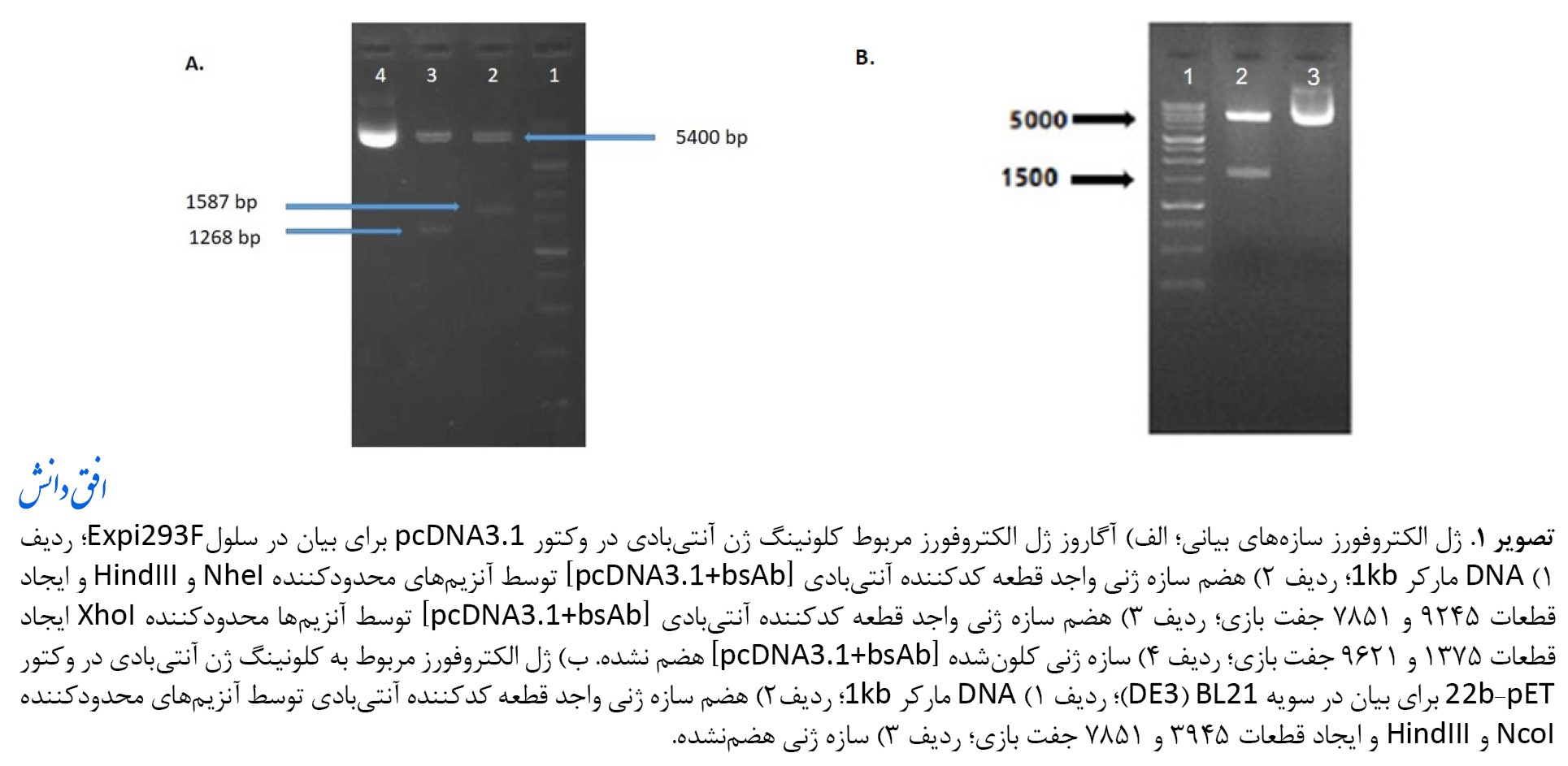 تصویر شماره 1-ب). در نهایت با تعیین توالی سازههای ایجادشده صحت کلونینگ در هر دو مورد تأیید شد.