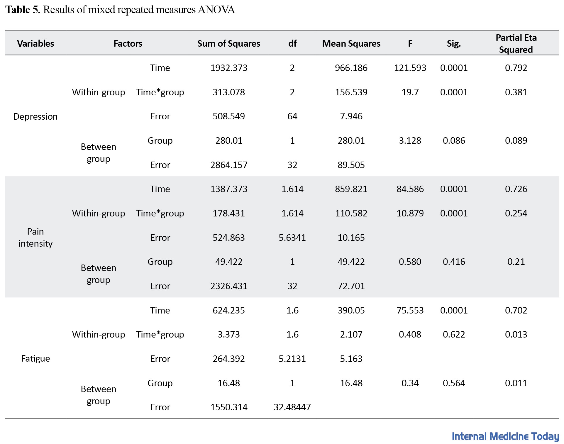 Therefore, a significant difference was found between the mean scores of depression in the pre-test, post-test, and follow-up, regardless of the test group. Moreover, the interaction between time and the group was significant in the depression index (P<0.001), which showed a difference in the mean score of depression in various times with regard to the variable categories of groups. In addition, the impact of the group on the mean score of pain intensity was not significant regardless of time (F=0.039, P=0.844). On the other hand, time had a significant effect on the variable of pain intensity (F=84.58, P<0.001). As such, there was a significant difference between mean scores of depression in the pretest, posttest, and follow-up regardless of the test group. Furthermore, there was a significant interaction between time and group regarding depression (P<0.001), which demonstrated that different mean scores of depression were different at various times depending on the variable categories of the group. On the other hand, the group had an insignificant effect on the mean score of depression regardless of time (F=0.680, P=0.416). In addition, time had a significant effect on the variable of fatigue (F=75.553, P<0.001). Accordingly, there was a significant difference in the mean scores of fatigue in the pretest, posttest, and follow-up stages regardless of the test group. Moreover, time and group had significant interaction in depression (P<0.001), which showed the difference between the mean scores of depression at different times according to the variable categories of the group. On the other hand, the group had an insignificant effect on depression score regardless of time (F=0.034, P=0.564)